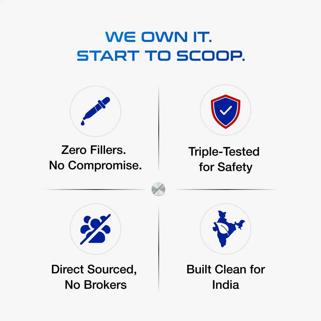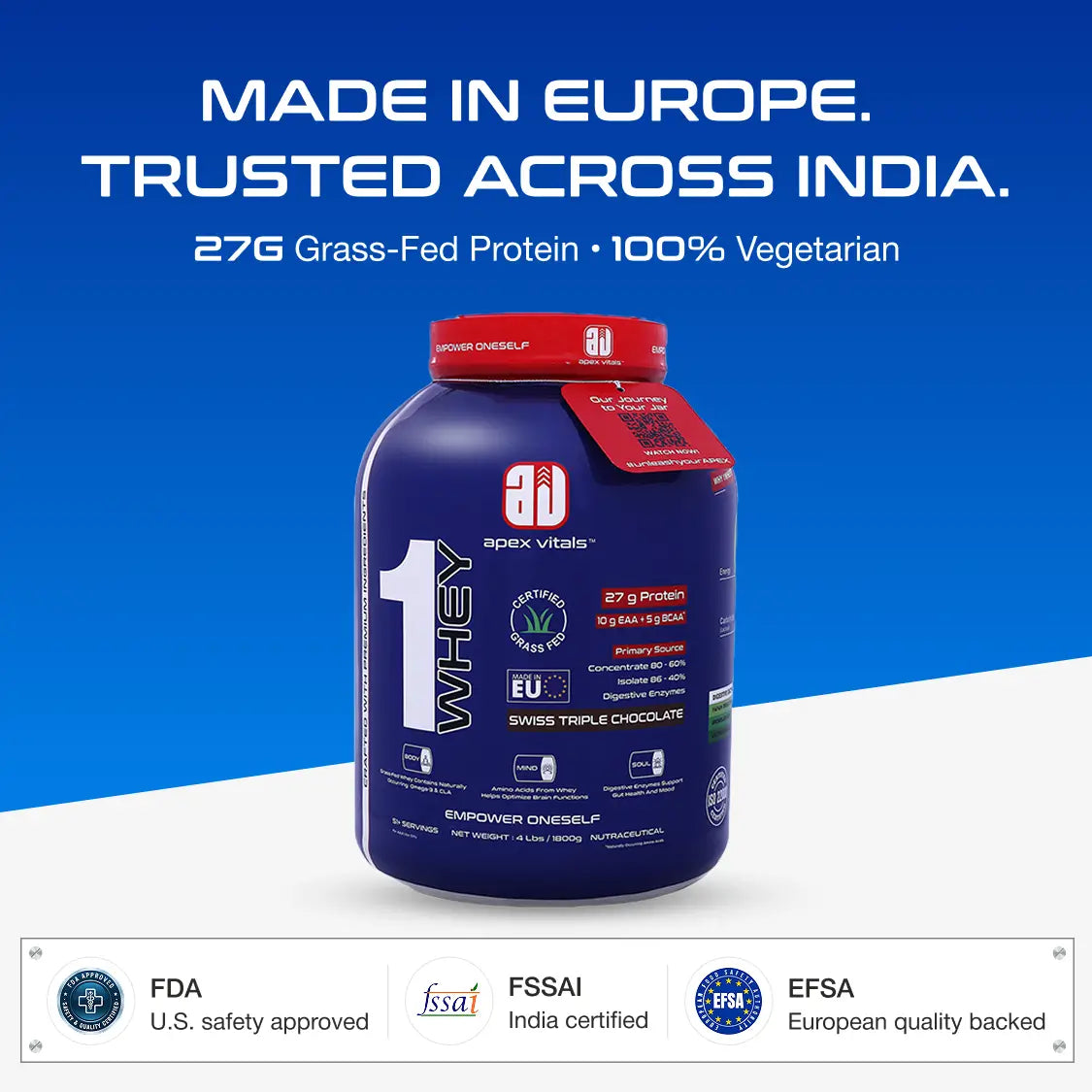 Apex Vitals Grass Fed Whey Protein features a smooth concentrate + isolate blend made from European grass fed whey, delivering 27g protein, 10g EAAs, and 5g BCAAs per serving for strong muscle support. Naturally rich in omega-3, CLA, and digestive enzymes, it fuels daily nutrition with a delicious chocolate taste. FDA, EFSA & FSSAI certified and lab-tested to ensure purity, safety, and reliable performance — every scoop, every time.