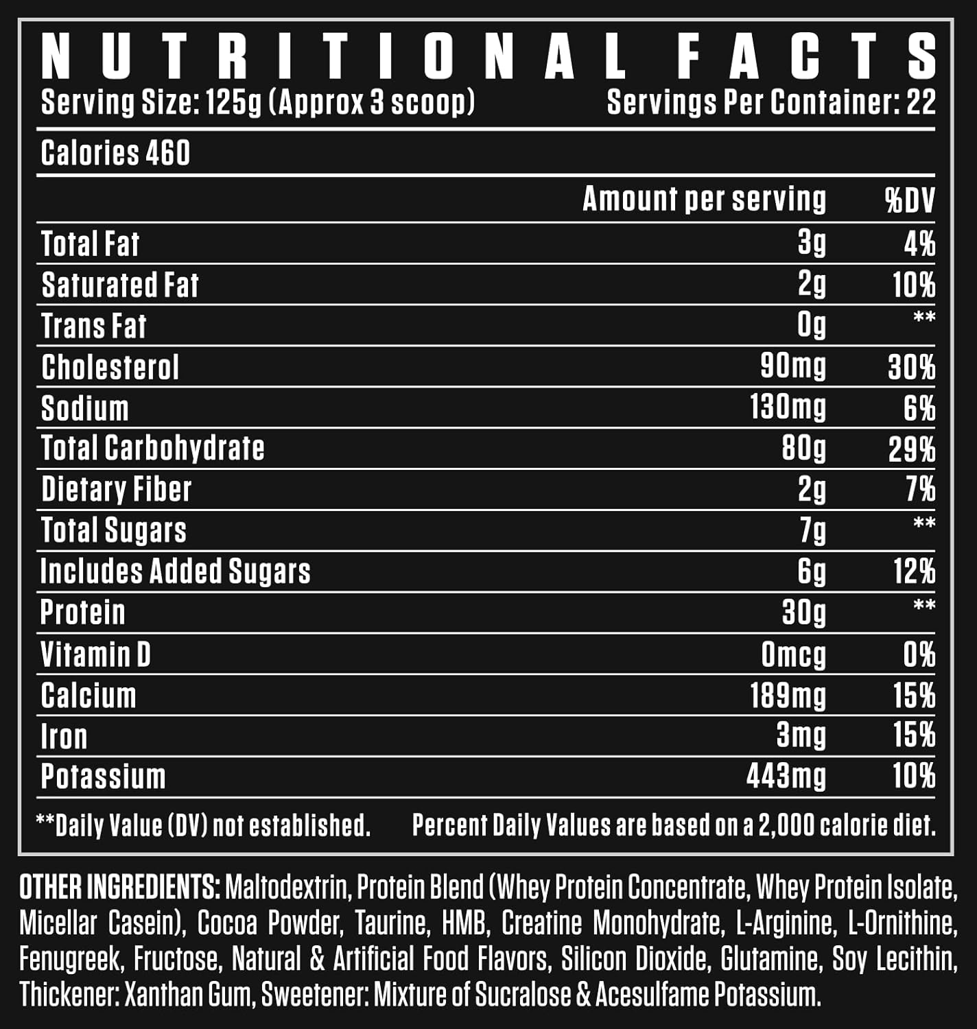 - Each serving of Anabolic Mass Gainer provides 60g of protein, 8g of fat, and 115g of carbohydrates, making it a high-calorie option for those looking to support their weight gain goals.