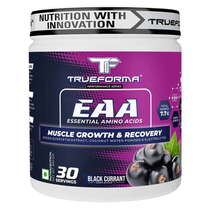 Trueforma® EAA provides all nine essential amino acids in a convenient, easy-to-mix formula. It is made with added ingredients like quercetin extract, coconut water powder, and electrolytes, offering a refreshing taste with every serving. Available in four flavours, it is suitable for individuals who prefer including EAAs in their daily routine.